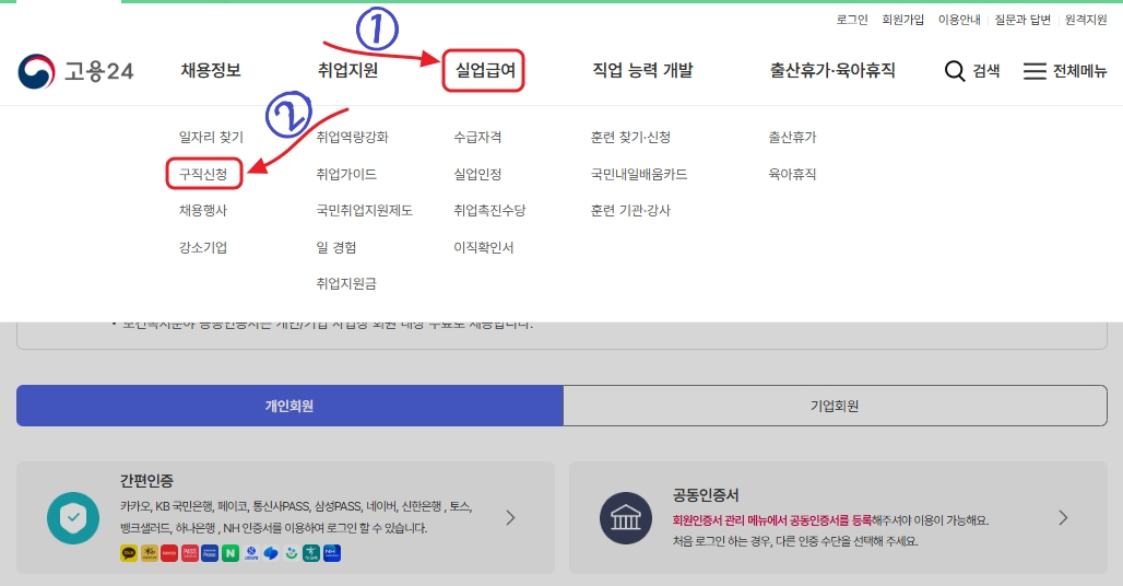 고용보험 24에 접속한 후, 로그인 화면에서 본인 인증을 완료합니다. 로그인 후, ①'실업급여' 탭을 선택하고, 그 안의 ② ‘구직신청’ 메뉴를 클릭합니다. 구직신청을 통해 실업급여를 받을 자격이 있는지 확인하면, 구직 활동을 시작한 것으로 간주됩니다.