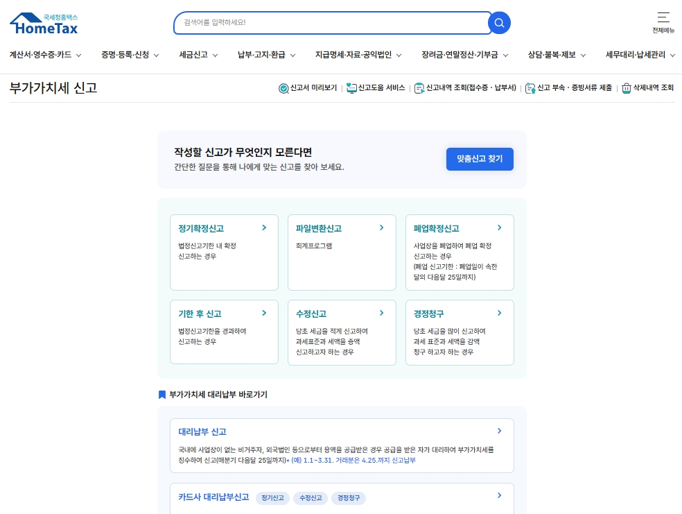 - "부가가치세 신고" 메뉴에서 매출·매입 자료 입력 후 신고 완료합니다.