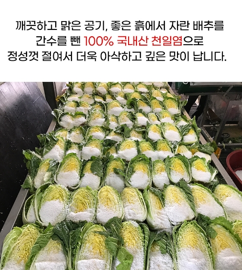 깨끗하고 맑은 공기, 좋은 흙에서 자란 배추를 간수를 뺀 100% 국내산 천일염을 사용하여 절여서 더욱 아삭하고 깊은 맛이 납니다.