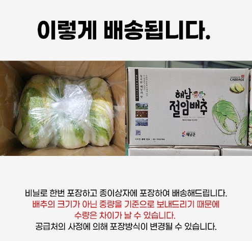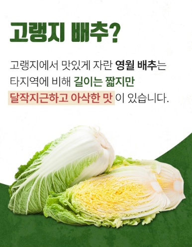 - 모두 지역의 특성을 살려 배추를 재배합니다. 해남의 배추는 해풍과 일조량이 풍부한 환경에서 자라며, 영월의 고랭지 배추는 고랭지의 서늘한 기후에서 아삭하고 달짝지근하게 자랍니다.