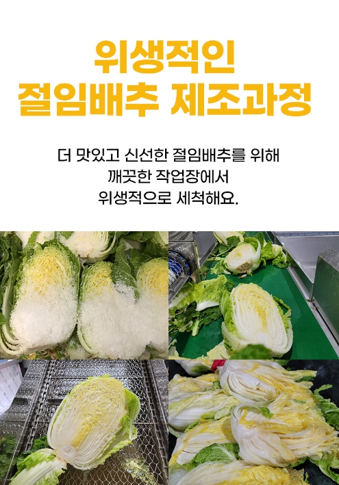 - 절임배추는 위생적인 작업장에서 여러 차례(3회 이상) 깨끗하게 세척됩니다. 세척 횟수는 상품마다 다르지만 모두 철저한 세척 과정을 거칩니다.