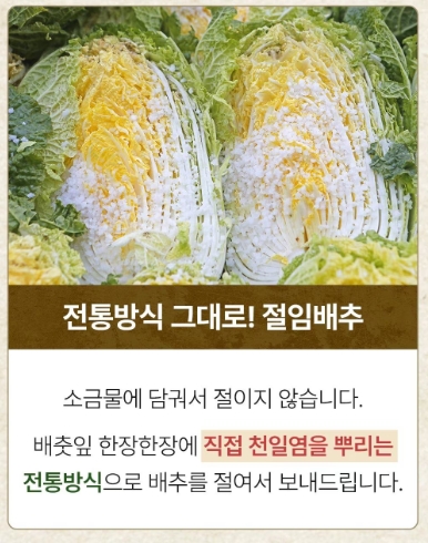 - 모든 상품이 100% 국내산 천일염을 사용하여 전통 방식으로 절임배추를 만듭니다. 영월 절임배추는 소금물 대신 잎마다 천일염을 뿌리는 방식으로 절여지는 차별화된 전통 방식을 사용합니다.