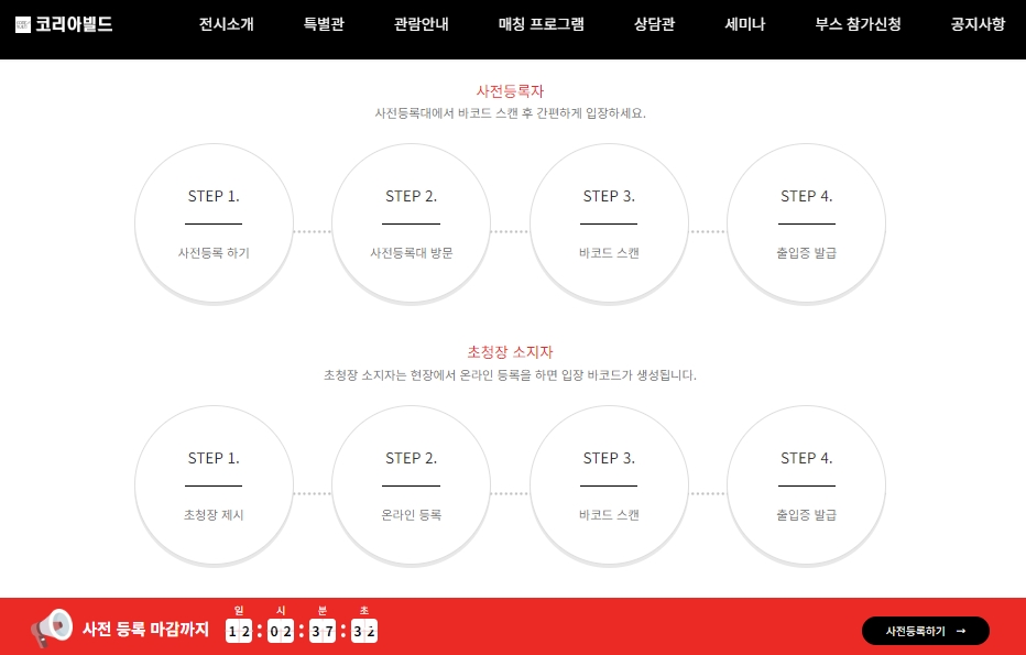 - 현장에서 출입증 발급 받기: 전시장 현장에서 사전등록대를 방문하셔서 사전등록을 확인하시면 출입증을 발급받으실 수 있습니다.
