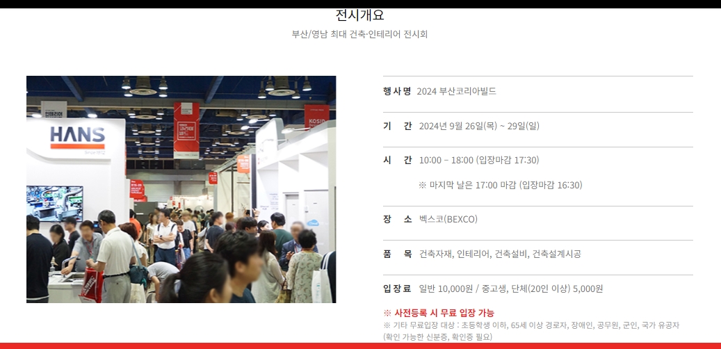 - 전시내용: 최신 트렌드의 건축자재, 인테리어, 건축설비, 건축설계시공