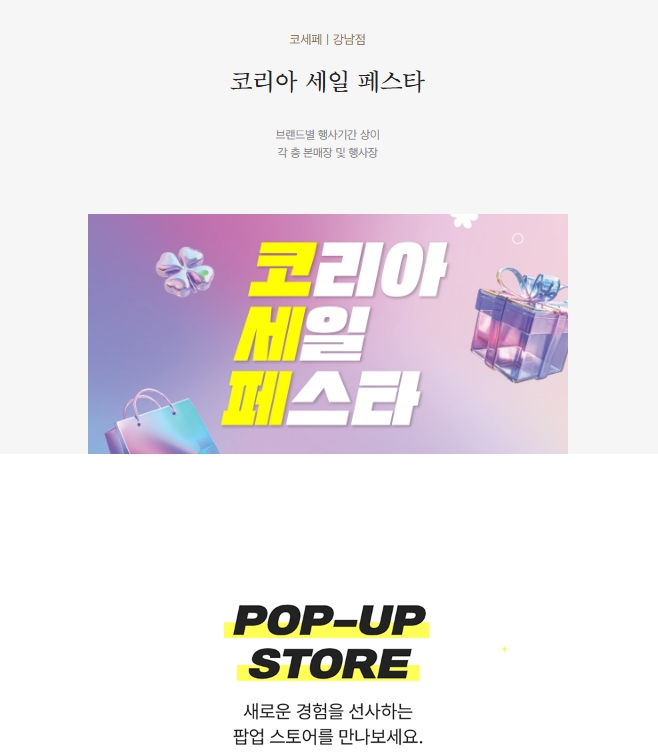 - 다양한 이벤트: 팝업 스토어, 문화 공연 등 다양한 이벤트를 통해 쇼핑의 즐거움을 더합니다.