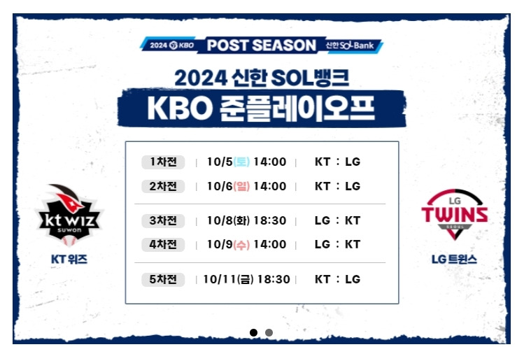- 1차전: 10월 5일 (토) 오후 2시, KT : LG