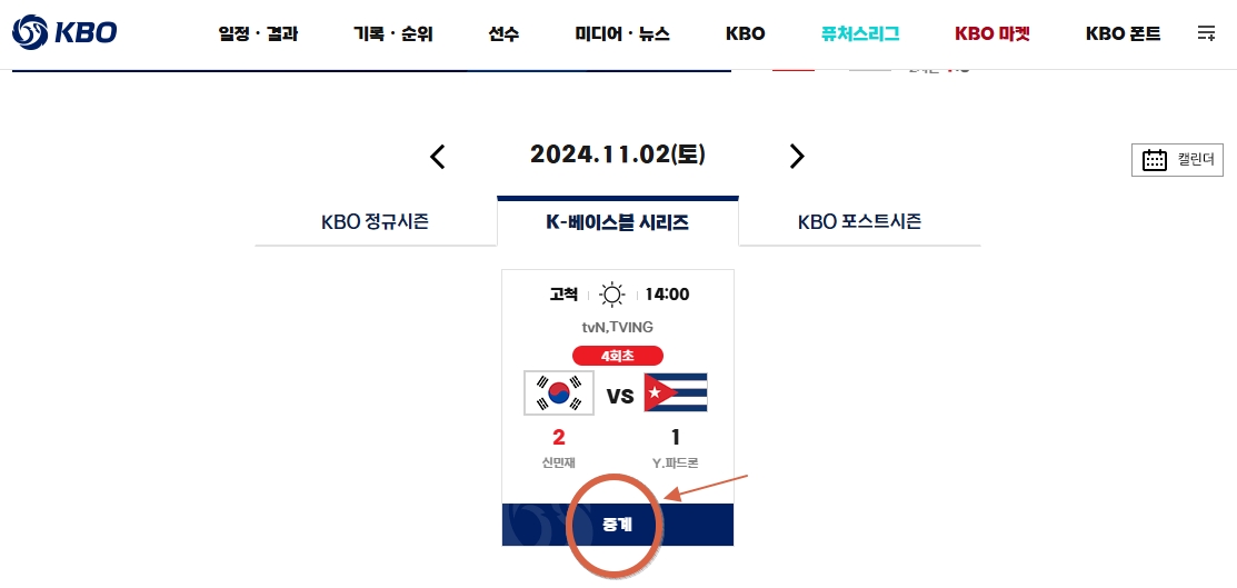 K-베이스볼시리즈 야구대표팀 쿠바와의 평가전 2차전 문자중계는 KBO 홈페이지에서 보실 수 있습니다. 회원가입과 로그인이 필요합니다.