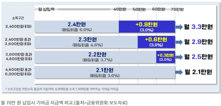 - 월 70만 원 납입 → 매칭 한도 확대(70만 원) + 매칭 비율 추가 → 기여금 월 3만 3000원