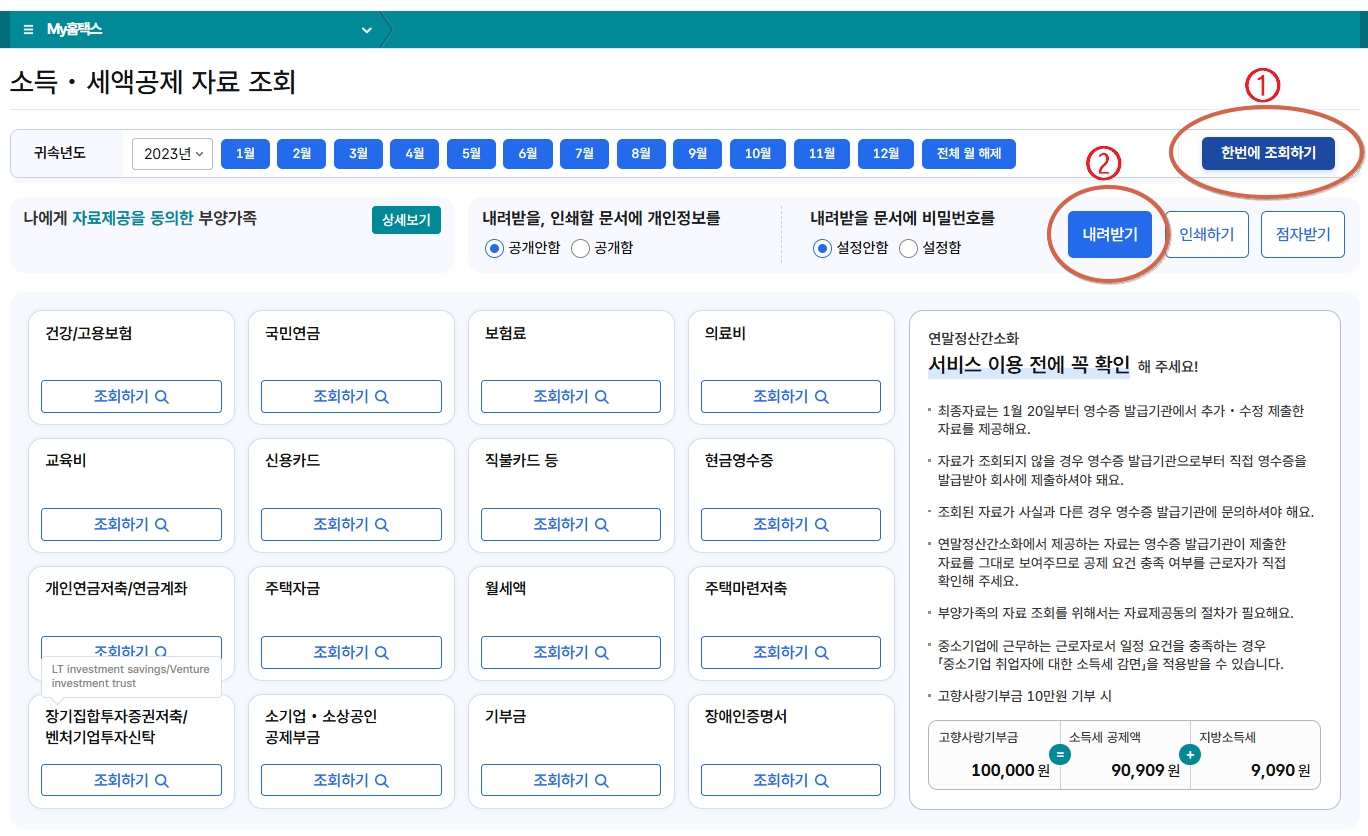 3. 자료 조회 및 내려받기: 해당년도(작년)와 근무한 달을 체크하고 공제받는 항목 별로 클릭한 후, ①한 번에 조회하기, ② 내려받기를 순서대로 클릭합니다.