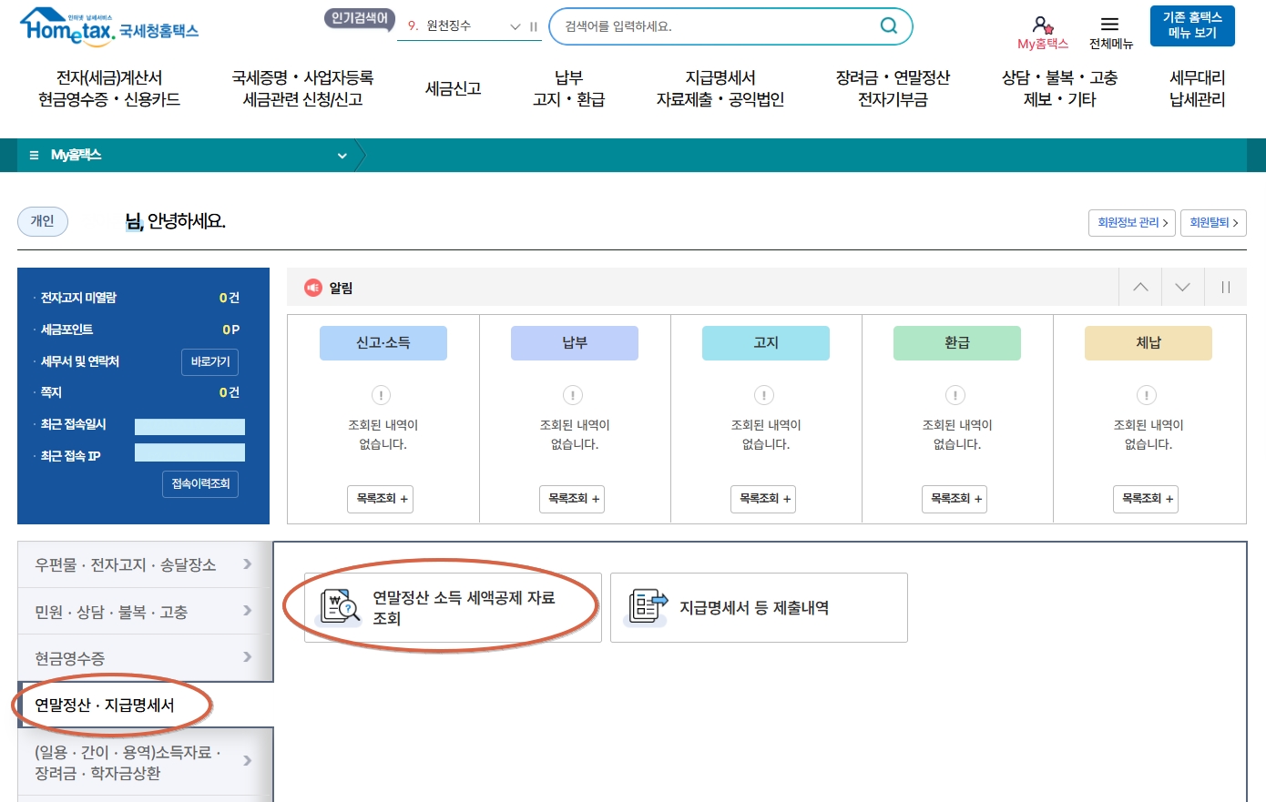 2. 연말정산 ∙ 지급명세서 선택: 메뉴에서 연말정산 소득 세액공제 자료 조회를 클릭합니다.