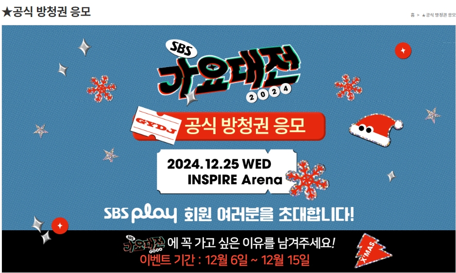 SBS 가요대전 방청 신청은 2024년 12월 6일(금)부터 12월 15일(일)까지 진행됩니다.